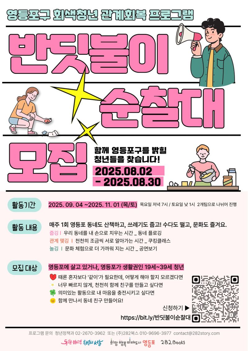 [파이낸셜뉴스] 서울 영등포구가 사회적 관계 형성에 어려움을 겪는 청년들을 지원하기 위한 ‘반딧불이 순찰대’를 운영하고, 8월 한 달간 참여자를 모집한다고 7일 밝혔다.