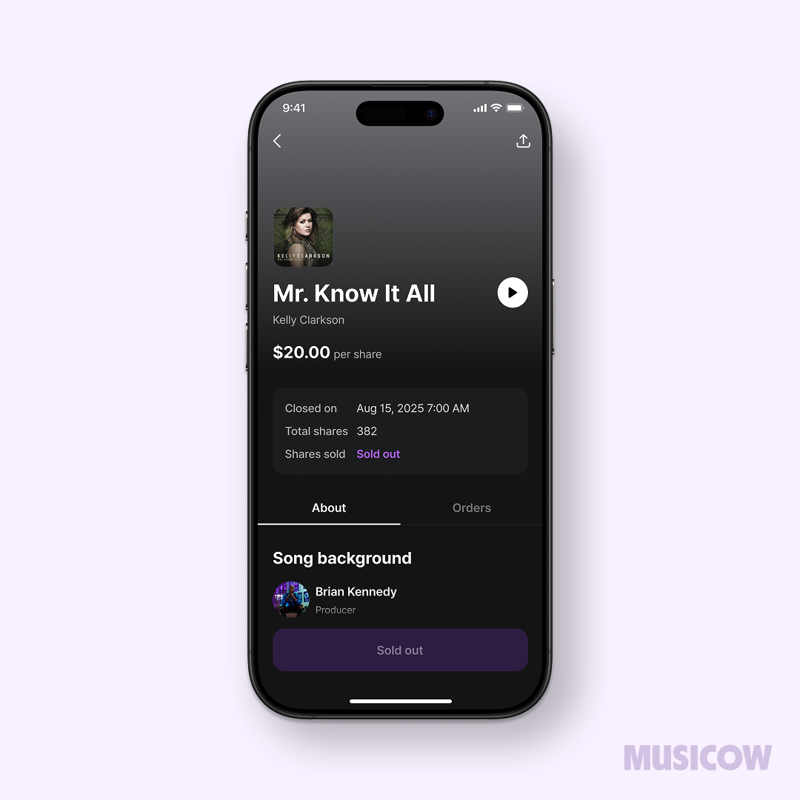 7일 뮤직카우에 따르면 팝스타 켈리 클락슨의 ‘미스터 노우 잇 올(Mr. Know It All)’ 저작권을 기초자산으로 한 1호 음악증권 공모 수량을 100% 다 판매했다.