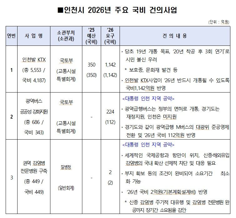 인천발 KTX 직결, 광역급행(M)버스, 감염병 전문병원 구축 지원