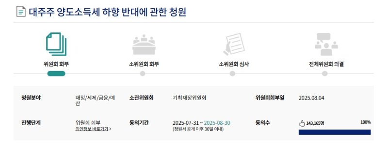 9일 국회 국민동의청원에 따르면 '대주주 양도소득세 기준 하향 반대' 청원에는 전날 오후 5시 기준 14만3165명이 동의했다. 지난달 31일 올라온 해당 청원은 이튿날인 지난 1일 상임위 회부 요건인 5만명을 이미 넘어섰다.