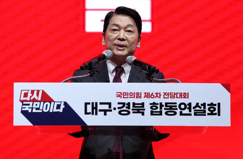 [서울=뉴시스]한은진 기자 = 안철수 국민의힘 당대표 후보는 9일 대구에서 열린 전당대회 합동연설회에서 유튜버 전한길 씨 주도로 갈등과 소란이 빚어진 것을 두고 "미꾸라지 한 마리가 사방팔방을 진흙탕으로 만들고 있다"고 말했다.