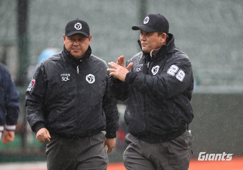 프로야구 경기 취소를 선언하는 심판. (롯데 자이언츠 제공)