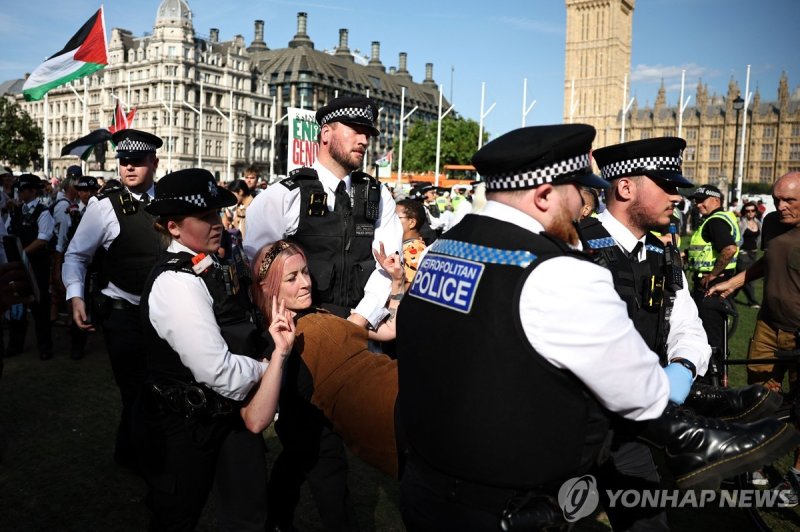 (런던=연합뉴스) 김지연 특파원 = 9일(현지시간) 영국에서 불법 단체로 지정된 '팔레스타인 행동'에 대한 지지 시위가 벌어져 약 200명이 경찰에 체포됐다.