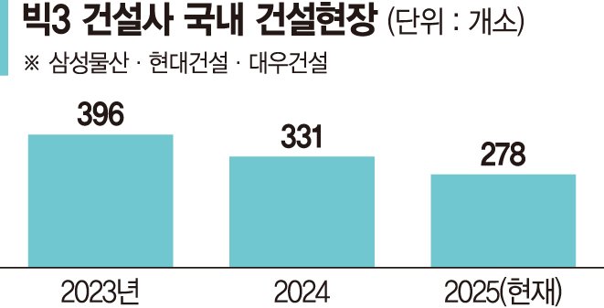 건설업 침체가 개선되지 않으면서 삼성물산·현대건설·대우건설 등 '빅3' 건설사들의 국내 건설현장이 2년 새 약 30% 감소한 것으로 나타났다. 불황 속 공사비 상승에 안전 리스크까지 겹치면서 업계 전반의 신음 소리가 갈수록 커지고 있다.