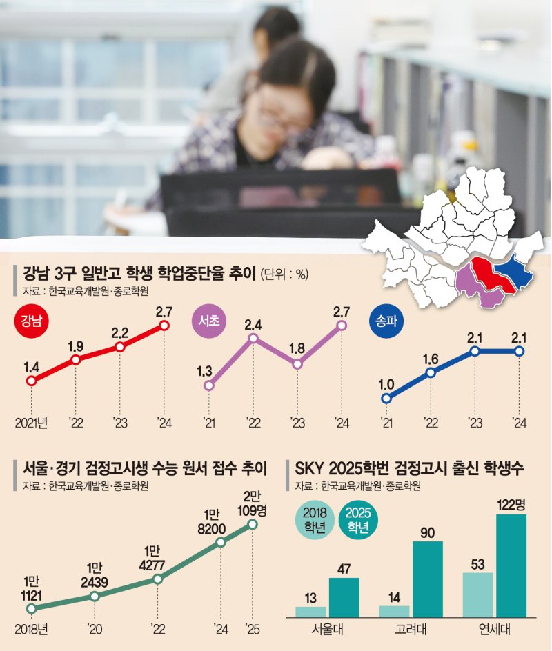 교육열로 이름 높은 '강남 3구(강남·서초·송파)'에서 오히려 학업을 중단하는 일반고 학생들의 비율이 높은 것으로 나타났다.