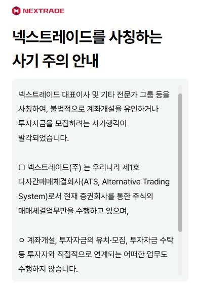 그러면서 넥스트레이드는 "따라서 상기 적시한 '넥스트레이드 사칭 계좌개설 유인' 등의 행위는 명백한 사기·불법행위"라며 "이에 대한 주의를 부탁드린다"고 했다.