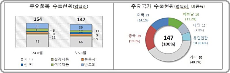 11일 관세청에 따르면 이달 1일부터 10일까지 수출 147억 달러, 수입 159억 달러로 전년 동기 대비 수출은 4.3%(6억6000만 달러)가 줄었고 수입은 13.6%(25억 달러 )가 감소했다.