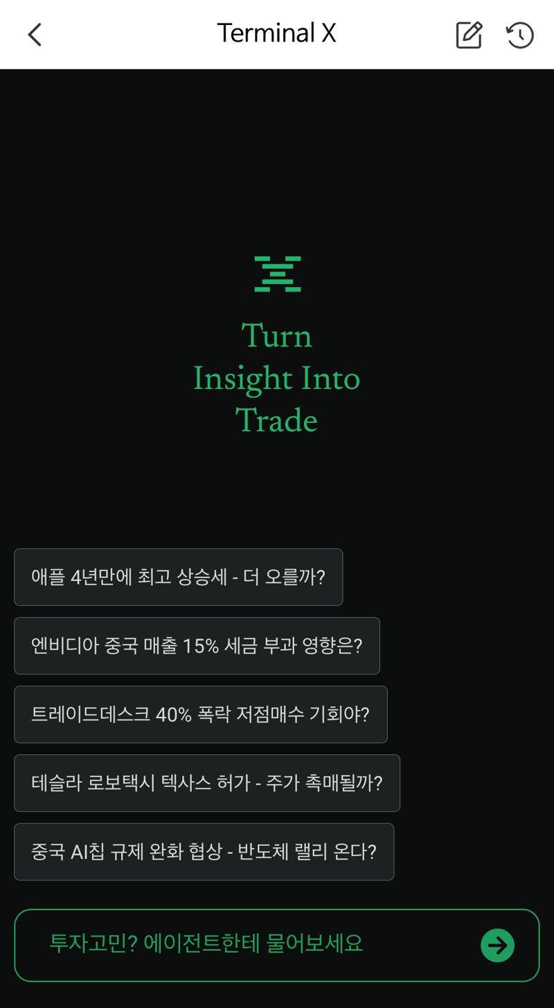 특히 터미널 엑스는 기존의 AI 플랫폼과 달리 투자 관련 실질적 질문을 던지고 해당 질문에 대한 AI의 분석 및 조언을 받을 수 있다는 특징이 있다. 예컨대 “테슬라 추가 매수해도 되는 시점인가” 등의 투자자들이 궁금해 하는 내용에 대한 의견을 제시하면서, 투자자로 하여금 자기 주도적 투자 결정을 내릴 수 있도록 돕는다.