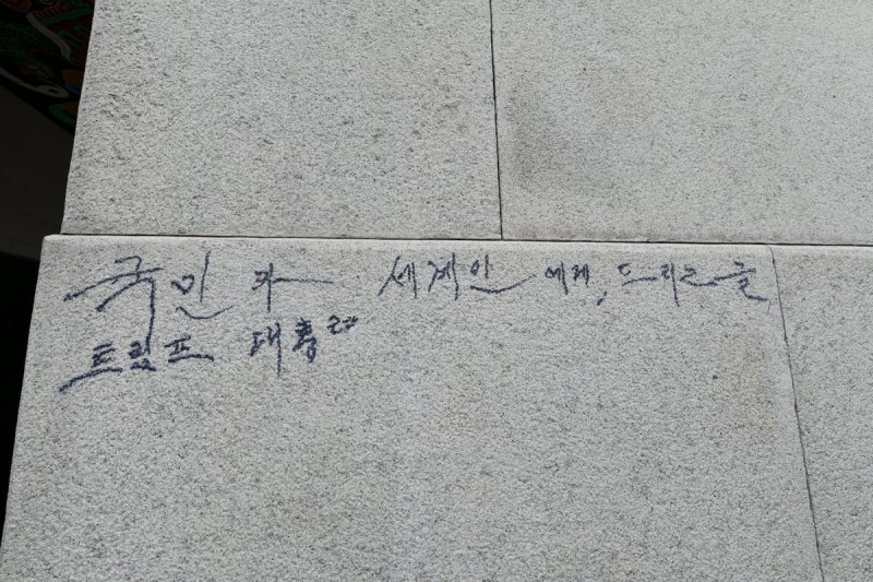 이 남성은 광화문 아래 석축 기단에 검은색 매직으로 '국민과 세계인에 드리는 글, 트럼프 대통령∼'이라고 쓴 것으로 확인됐다.
