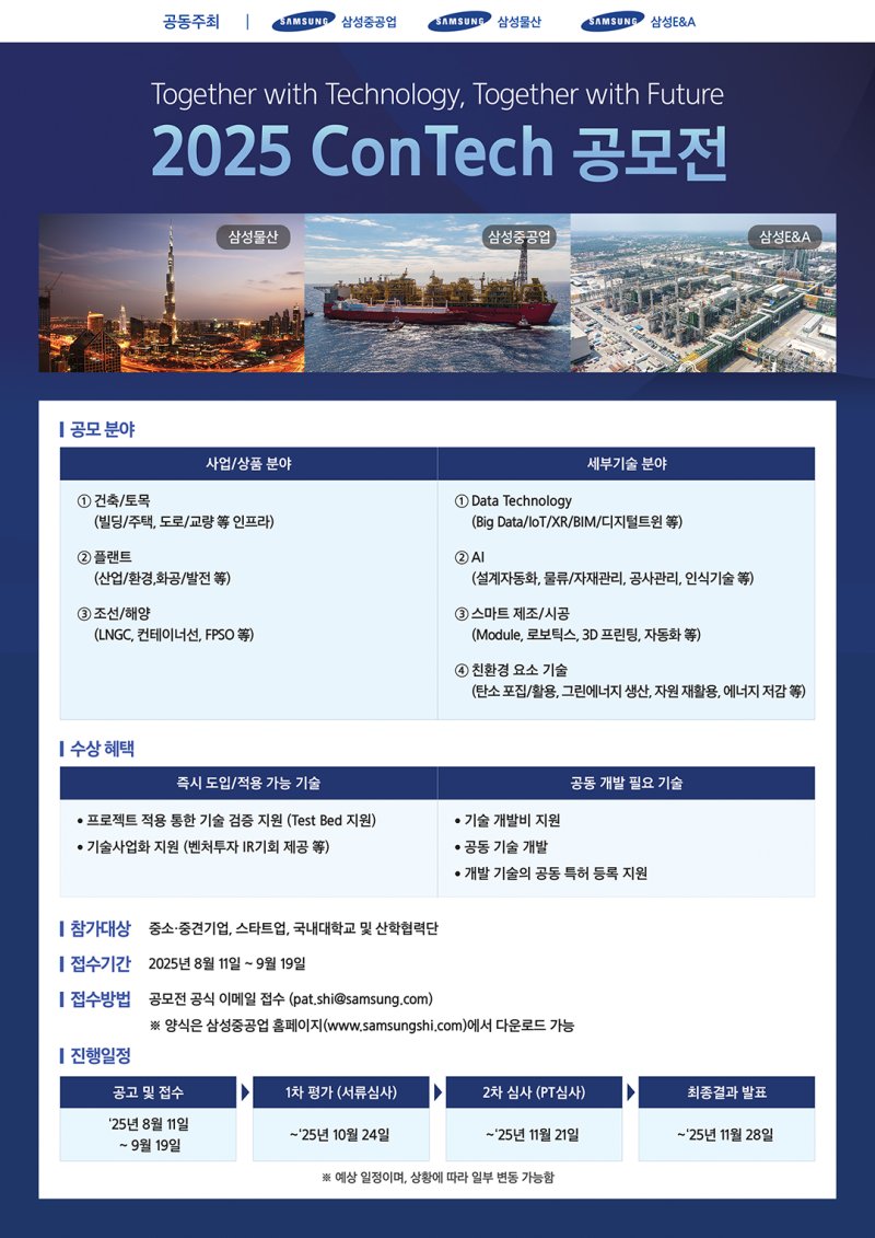 공모전 관계자는 "EPC 분야 혁신 기술과 아이디어를 가진 기업, 단체와 협력할 수 있는 기회가 되기를 기대한다"며 "발굴된 기술은 삼성 EPC 3사의 다양한 사업 분야에서 폭넓게 검토·활용될 것"이라고 밝혔다.
