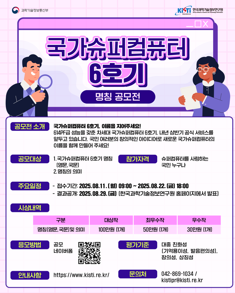 공모는 '국가 슈퍼컴퓨터 6호기'의 국·영문 명칭과 그 의미를 함께 제출하는 방식으로 △대중 친화성(기억용이성, 발음 편의성) △창의성(참신성, 독창성, 상상력) △상징성(6호기의 정체성과 가치 반영도)을 기준으로 심사된다. 공모 결과는 8월 29일 KISTI 홈페이지를 통해 발표되며, 대상작(1순위)은 '국가 슈퍼컴퓨터 6호기'의 공식 명칭으로 채택되고 상금 100만원이 수여된다. 최우수작(2순위)과 우수작(3순위)에는 각각 50만원과 30만원의 상금이 수여된다.