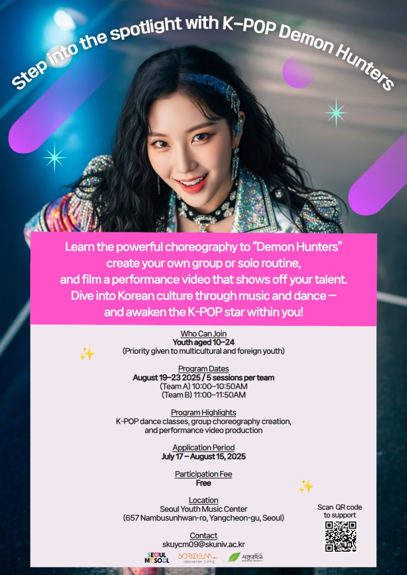 프로그램은 서울 거주 외국인 및 다문화 청소년(만 10~24세)을 대상으로 한다. 프로그램에는 ▲K-pop 댄스 실기 ▲그룹 안무 창작 ▲무대 퍼포먼스 연출 ▲댄스 비디오 촬영 ▲결과 발표회 등이 포함되며 참가비는 무료다.
