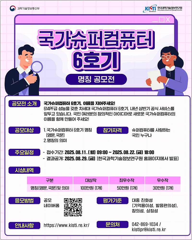 국가 슈퍼컴퓨터 6호기의 구축 목적과 활용 비전을 공유하고 국민적 공감 및 상징성을 담은 명칭을 발굴하기 위한 이번 공모에는 슈퍼컴퓨터를 활용하는 산·학·연 연구자뿐 아니라 일반 국민 누구나 참여할 수 있다.