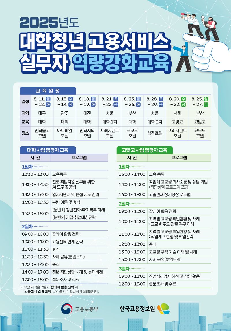 한국고용정보원과 고용노동부는 이번 교육을 통해 빅데이터·인공지능(AI) 기반 맞춤형 진로탐색 프로그램 활용법, 입사지원서 및 면접 지도 전략, 청년친화 주요 직무 등을 교육할 예정이다.
