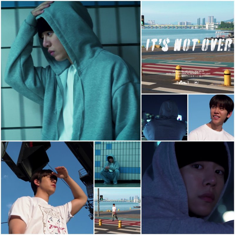 이어 고층 빌딩 불빛이 반짝이는 한강변 난간에 기대 도시를 바라보는 장면이 이어지고, 이번 활동의 메인 슬로건 '잇츠 낫 오버(IT'S NOT OVER)'가 화면에 선명히 드러난다.