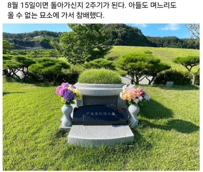 이 교수는 11일 자신의 페이스북에 “8월 15일이면 돌아가신지 2주기가 된다”며 “아들(윤 전 대통령)도 며느리(김건희 여사)도 올 수 없는 묘소에 가서 참배했다”고 적었다. 고 윤기중 교수는 지난 2023년 8월 15일 노환으로 별세, 오는 15일 별세 2주기를 맞는다.