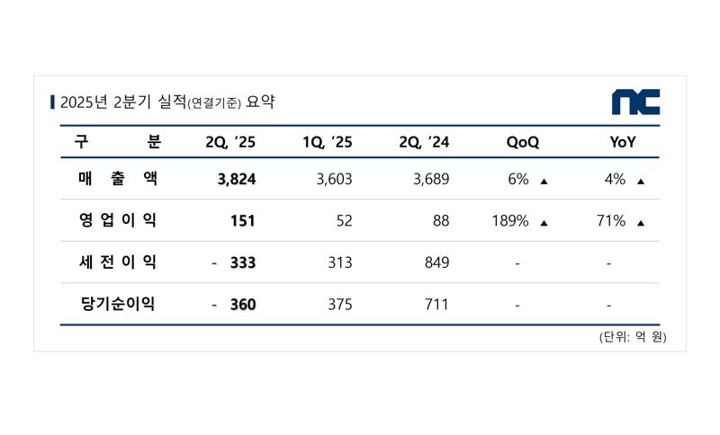 엔씨는 2분기 연결기준 매출 매출 3824억원, 영업이익 151억원, 당기순손실 360억원을 기록했다고 12일 밝혔다.