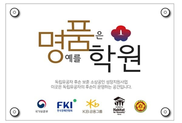 12일 보훈부는 독립유공자 후손이 운영하는 서울 도봉구 미술교습소에서 권오을 장관과 류진 한국경제인협회 회장, 양종희 KB금융그룹 회장 등이 참석한 가운데 1호 명품가게 현판식을 13일 개최한다며 이같이 밝혔다.