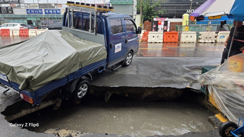 (부산=연합뉴스) 손형주 기자 = 11일 오전 11시 5분께 부산 사상구 새벽시장 정만 앞 도로에 세로 5m, 가로 1m 크기의 대형 땅 꺼짐(싱크홀) 현상이 발생했다.