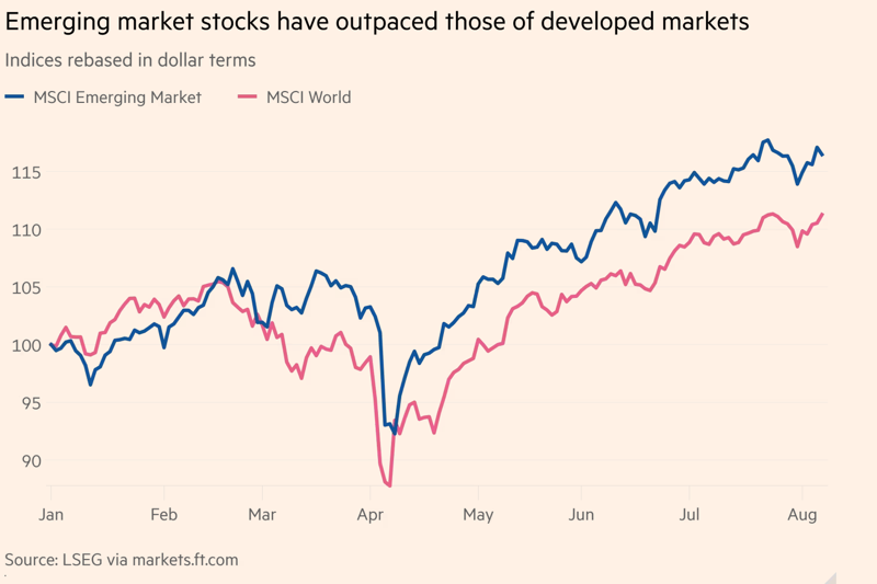 최근 글로벌 무역 불안으로 신흥국이 가장 큰 타격을 받을 것이라는 우려에도 MSCI 신흥국 지수는 올들어 달러 기준 16% 이상 상승했다. 이는 MSCI 선진국 지수의 11% 상승률을 웃도는 수치다. 미국 대표 지수인 스탠더드앤드푸어스(S&P)500이 같은 기간 8.6% 상승한 것과 비교하면 두 배 수준이다.