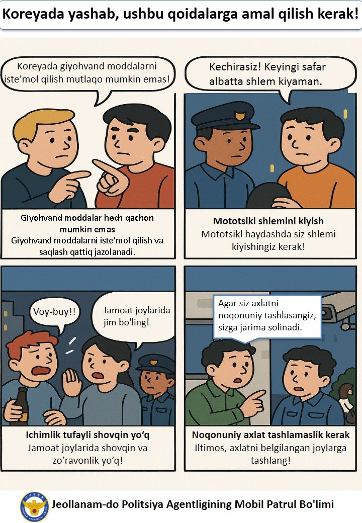 전단에는 '한국에서 거주하며, 다음 규칙을 지켜야 한다', '한국에서는 마약을 절대 사용할 수 없다', '오토바이를 운전할 땐 반드시 헬멧을 착용해야 한다', '공공장소에서 소란과 폭력을 일으키지 마세요', '불법으로 쓰레기를 버리면 과태료가 부과됩니다' 등의 내용이 담겼다.
