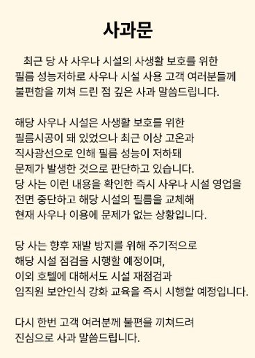 이와 관련해 코오롱호텔 측은 12일 공식 홈페이지를 통해 팝업 공지를 내고 "해당 사우나 시설은 사생활 보호를 위한 필름시공이 돼 있었으나 최근 이상 고온과 직사광선으로 인해 필름 성능이 저하돼 문제가 발생한 것으로 판단하고 있다"며 "즉시 사우나 시설 영업을 중단하고 해당 시설의 필름을 교체해 현재 사우나 이용에는 문제가 없는 상황"이라고 밝혔다.