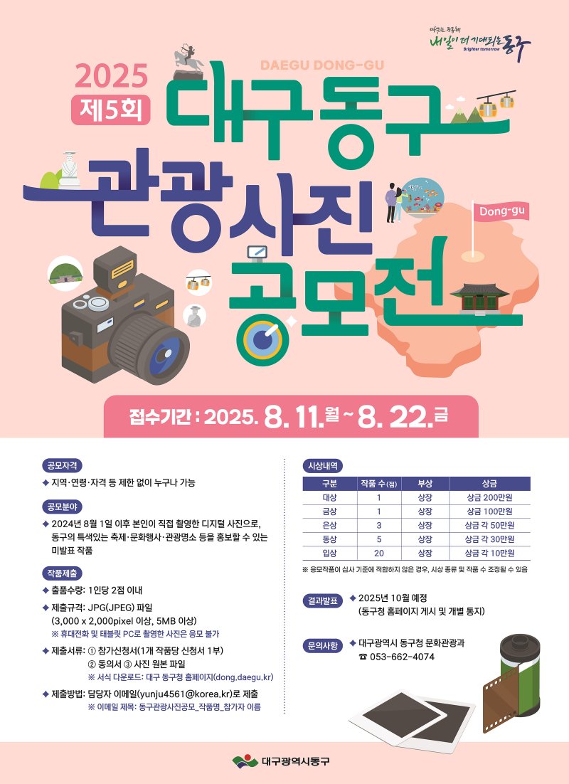 12일 구에 따르면 창의적이고 희소성 있는 지역 관광자원 발굴을 위한 공모전엔 시민 누구나 참여할 수 있으며, 대구 동구의 축제·문화행사·관광명소를 주제로 한 사진을 제출하면 된다.