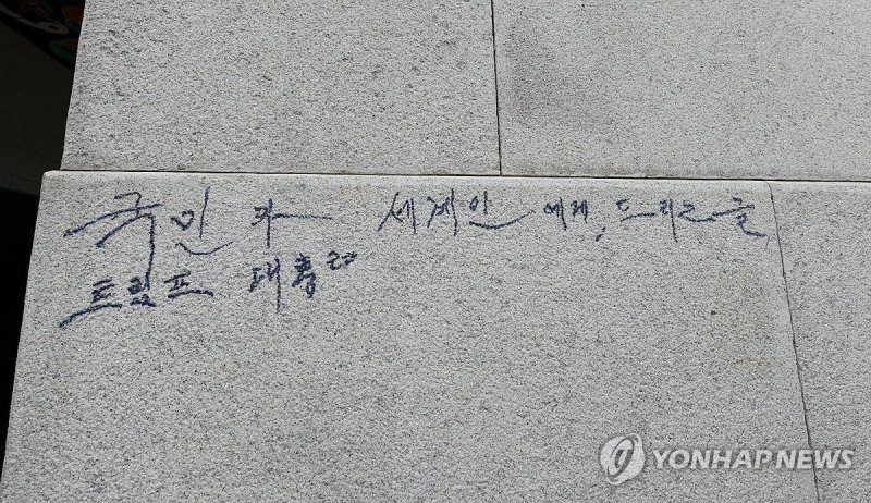 A씨는 전날 광화문 석축에 '국민과 세계인에게 드리는 글, 트럼프 대통령'이라고 쓰던 중 경복궁관리소 관계자에게 적발됐다.jyseo@fnnews.com 서지윤 기자
