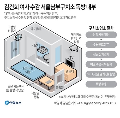 13일 법조계에 따르면 김 여사는 구치소 도착 후 신체검사와 인적 사항 확인을 거쳐 수용번호를 부여받았다. 키와 몸무게 측정, 소지품 영치가 이어졌고, 카키색 미결 수용자복으로 갈아입은 뒤 수용번호가 부착된 ‘머그샷’ 촬영을 마쳤다. 교정 당국은 보안과 심리적 안정을 고려해 김 여사를 독방에 배정했다.