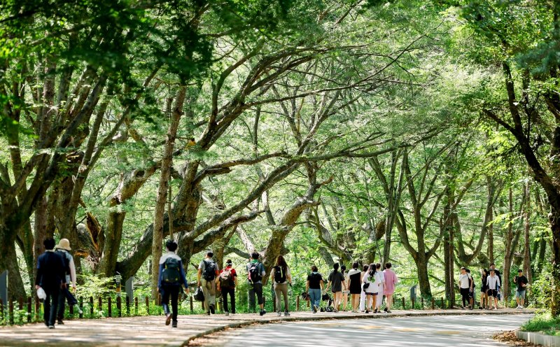 나무 그늘 아래 숲길은 무더운 날씨에도 한결같이 청량함을 유지하며 걷는 이들에게 여름 숲의 위안을 전한다.