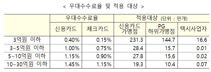 신용카드사맹점뿐 아니라 결제대행업체(PG사) 하위가맹점 186만4000개(전체 200만1000개 중 93.2%), 교통정산사업자를 통해 카드결제를 수납하는 개인·법인 택시사업자 16만6000개(전체 16만7000개 중 99.5%)에 대해서도 동일한 우대수수료율이 적용된다. 이들까지 포함하면 이번 정책 혜택 범위에 들어가는 대상은 509만8000개다.