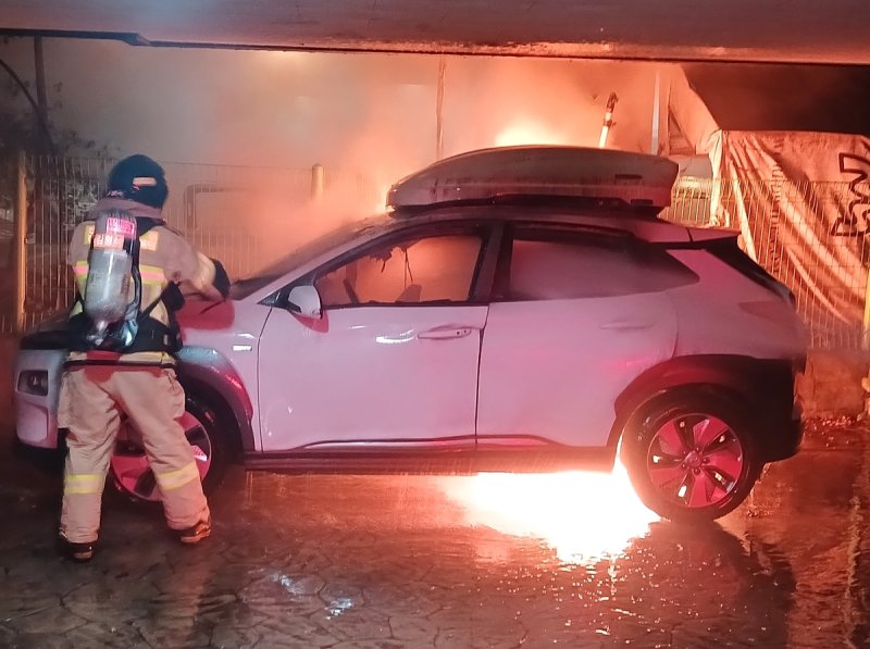 13일 인천소방본부에 따르면 오전 4시 36분께 인천시 계양구 귤현동 빌라 주차장에 있던 코나 전기차에서 불이 났다.
