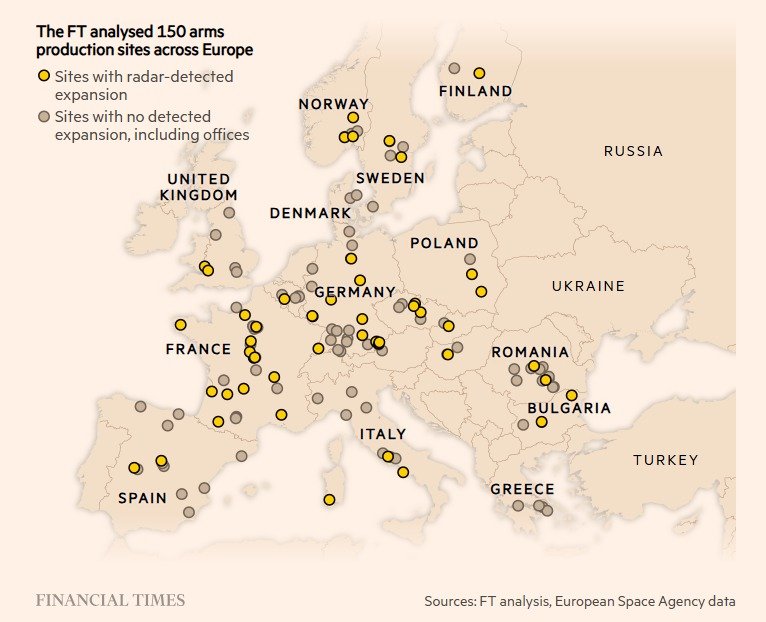12일 파이낸셜타임스(FT)가 37개 기업의 150개 시설에 대한 레이더 위성 데이터를 분석한 결과, 2022년 러시아의 우크라이나 전면 침공 이후 유럽 무기 시설의 건설 활동은 세 배 이상 급증한 것으로 나타났다.