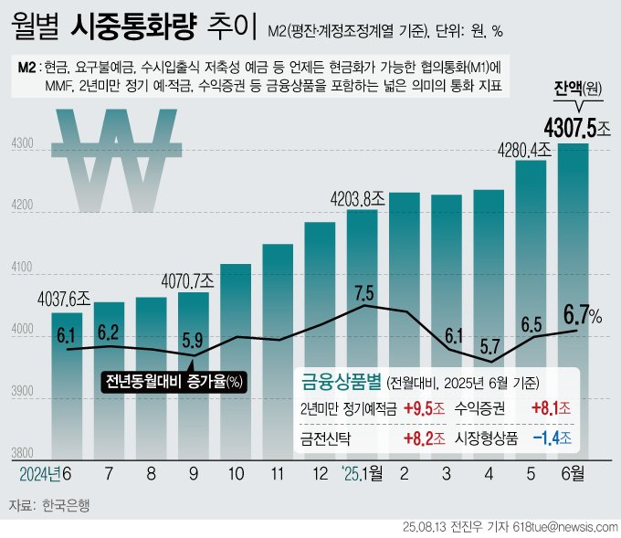 한국은행이 13일 발표한 '2025년 6월 통화 및 유동성'에 따르면 올해 6월 M2(광의통화, 평잔)는 전월대비 27조1000억원(+0.6%) 증가한 4307조5000억원을 기록했다.