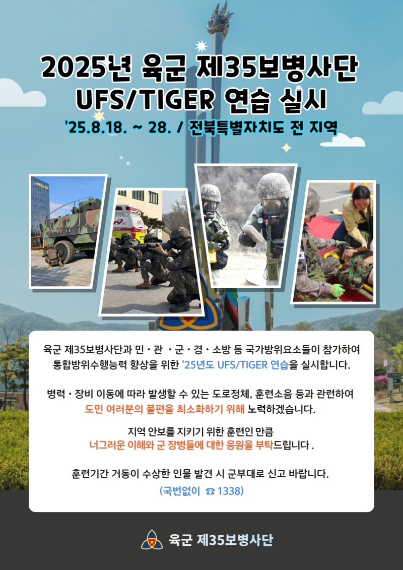 [파이낸셜뉴스] 육군 제35보병사단이 18~28일까지 11일간 전북 전역에서 '2025년도 UFS/TIGER 연습'을 실시한다.