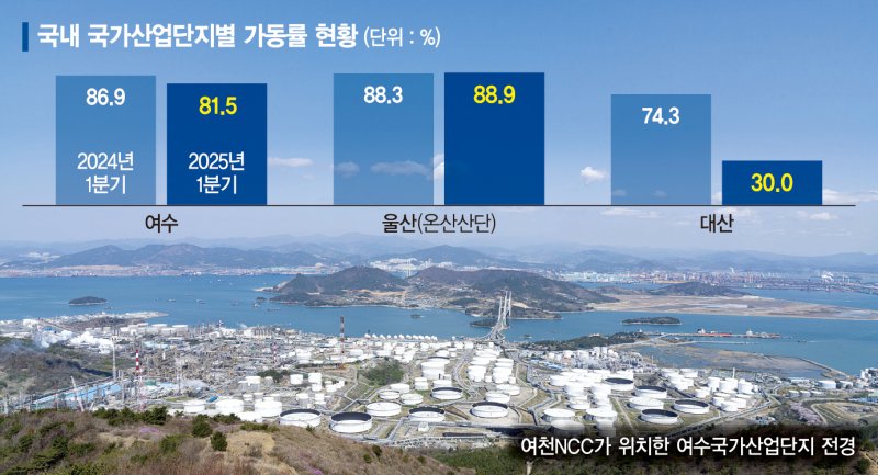 13일 업계에 따르면 올해 1·4분기 국내 나프타분해시설(NCC) 평균 가동률은 78.6%로 손익분기점(85%)을 크게 밑돌았다. 특히 여수산단은 지난 2021년 87%였던 가동률이 지난해 78.5%까지 떨어졌다.