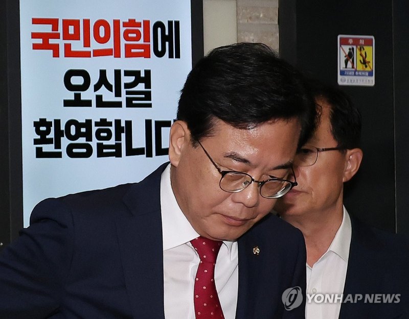 (서울=연합뉴스) 최평천 기자 = 국민의힘 송언석 비상대책위원장 겸 원내대표 등 지도부는 14일 김건희 특검의 당사 압수수색에 반발하며 철야 농성에 돌입했다.