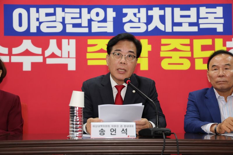정점식 사무총장은 "지도부 모두가 지역 일정으로 자리를 비운 사이에 특검팀이 느닷없이 빈집털이식 압수수색을 버젓이 자행한 것은 무자비한 정치 보복을 의심하기에 충분하다"고 말했다.