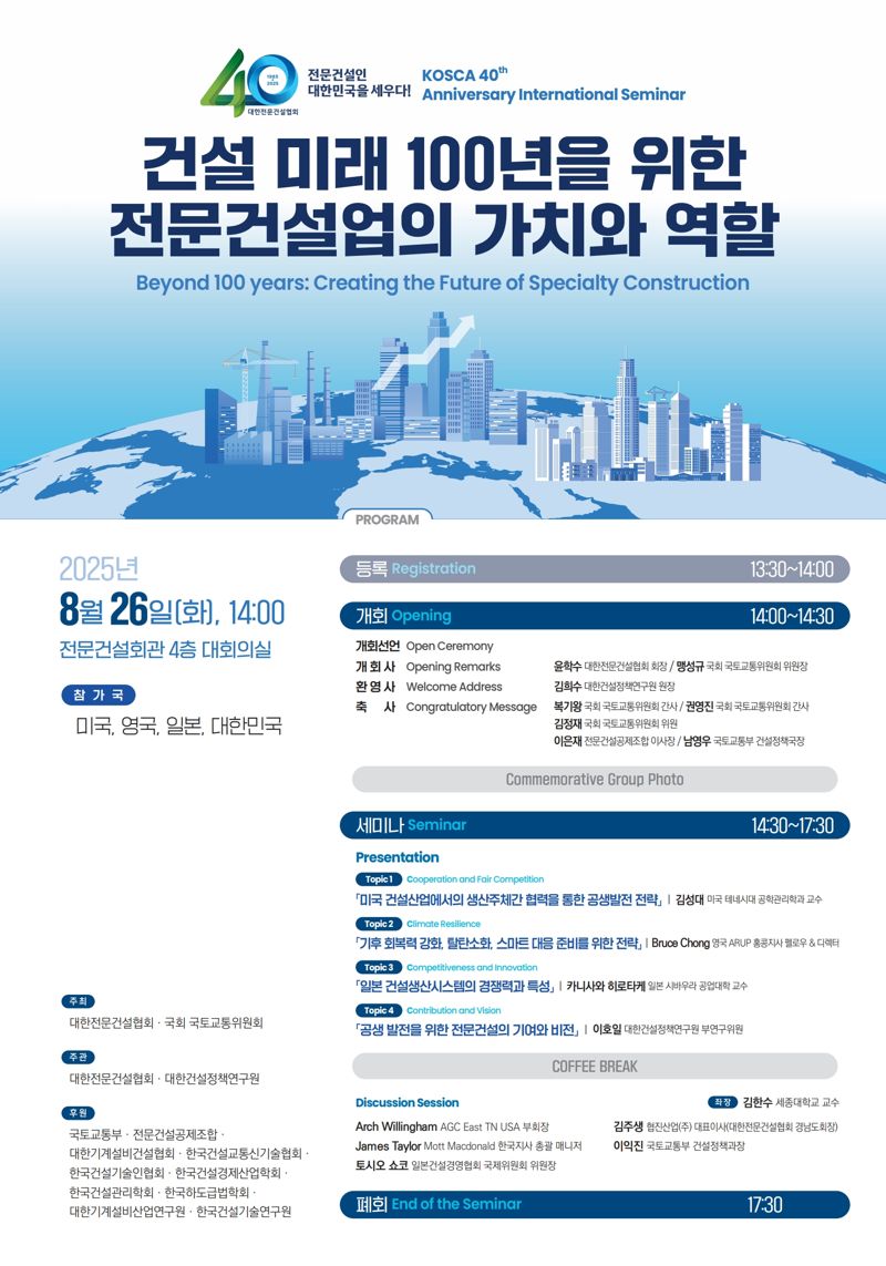 이번 국제 세미나는 협회 창립 40주년 기념사업의 일환으로 마련됐다. 국내·외 학계 및 산업계 전문가들이 모여 글로벌 건설환경 변화 속에서 전문건설업의 미래 역할을 조명하고, K-건설의 지속가능한 발전 방안을 모색할 예정이다.