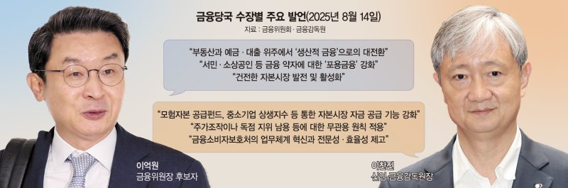 베일이 걷힌 이재명 정부 두 금융당국 수장이 일제히 기존 금융전략에 혁신을 꾀하는 한편 취약계층을 품어 안겠다는 정책 방향성을 제시했다. 업무를 시작한 금융감독원 원장은 주가조작 등 불법행위를 향한 엄벌도 예고해 금융권이 바짝 긴장하고 있다. 다만 두 수장 모두 금융당국 내부, 금융권에서 관심을 모으고 있는 금융위와 금감원의 조직개편과 관련해서는 말을 아꼈다.