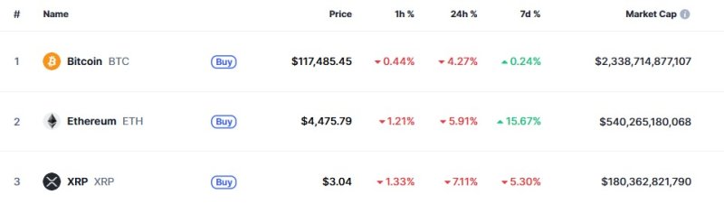 15일 오전 6시 50분 현재 글로벌 코인 시황 중계사이트인 코인마켓캡에서 비트코인은 24시간 전보다 4.27% 하락한 11만7485달러를 기록하고 있다.