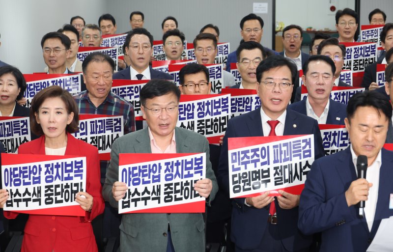이들은 '민주주의 파괴 특검, 당원 명부 절대 사수' '야당 탄압 정치 보복, 압수수색 중단하라' 문구가 적힌 피켓을 들고 "헌정 파괴 야당탄압을 즉각 중단하라" 등의 구호를 외쳤다.