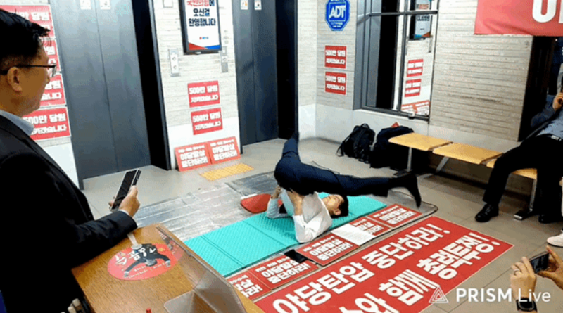국민의힘 중앙당사 1층 로비 바닥에 앉아 농성을 이어가던 김 후보가 갑자기 자리에서 일어나더니 정장 재킷을 벗고 팔굽혀펴기를 시도했다.