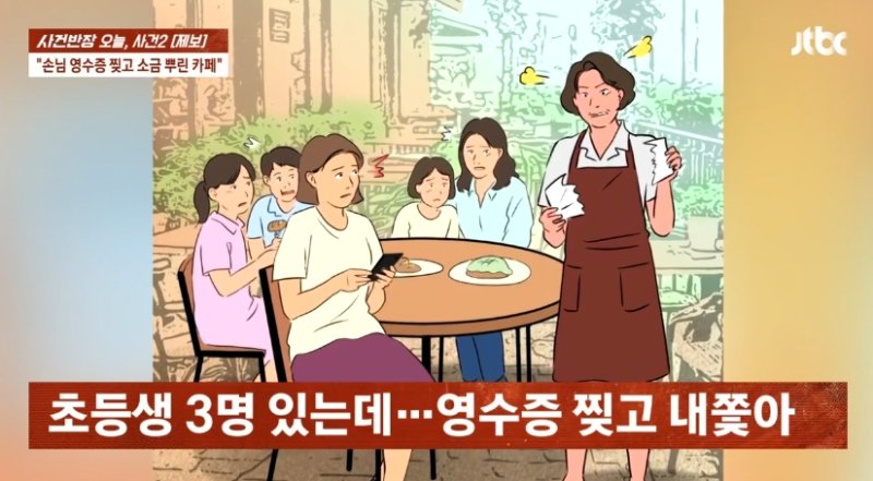 13일 방송된 JTBC '사건반장'에 따르면 제보자 A씨는 지난 9일 오후 4시 30분경 초등학교 1학년 아들과 지인 그리고 지인의 초등학교 1학년, 3학년 자녀와 함께 카페를 방문했다.