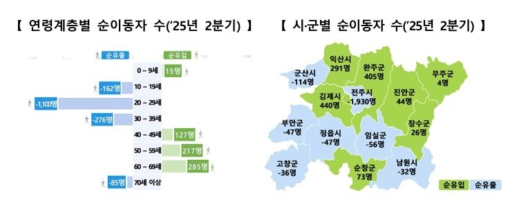 전북지역 순이동자 수는 지난해 같은 분기(2024년 2분기) -1157명에 이어 △2024년 3분기(-1807명) △2024년 4분기(-285명) △2025년 1분기(-1980명) 등 최근 하향 곡선을 그리고 있다.