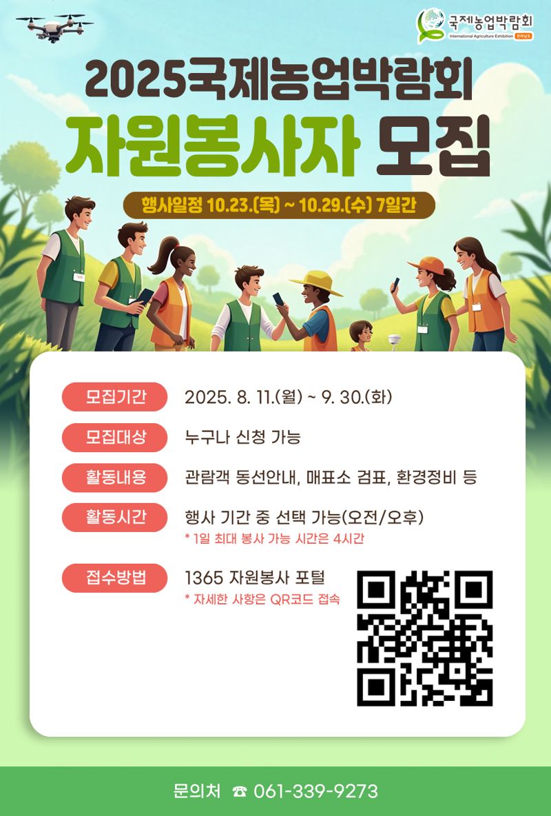 (재)전남도국제농업박람회 사무국은 오는 9월 30일까지 2025 국제농업박람회 자원봉사자 420명을 모집한다고 밝혔다.