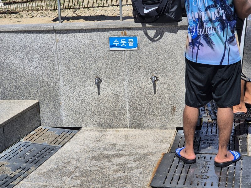 16일 강원 강릉 경포해수욕장 중앙광장. 모래를 씻기 위해 세족장에 모여든 피서객들은 황당한 표정을 지었다. 세족장 수도꼭지가 통째로 사라져 물을 쓸 수 없었기 때문이었다.