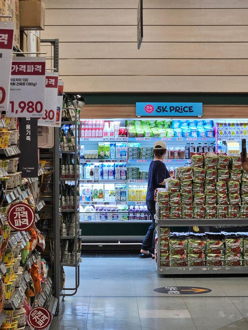지난 16일 오후 7시께 찾은 서울 중구 이마트 청계천점. 연휴를 맞아 장을 보러 온 고객들로 붐비는 가운데 마트 한 코너에서는 직원이 갖가지 우유 제품을 냉장고에 진열하느라 분주했다. 이 직원은 "많이 팔려서 제품을 다시 채워 넣고 있다"고 말했다. 우유제품을 진열한 곳은 '오케이프라이스(5K PRICE)' 코너로 소비자들의 발길이 이어졌다. 저온살균우유를 살펴보던 김모씨(51)는 가격표를 확인하더니 같은 제품 하나를 카트에 더 담았다. 김씨는 "처음 보는 건데 가격이 저렴하고 용량도 700mL보다 작아서 담아봤다"고 말했다.