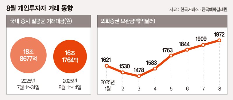 국내 가상자산 거래도 증가세다. 국내 가상자산 거래대금의 60%가량을 차지하는 거래소 업비트의 지난 15일 거래대금은 57억달러에 이른다. 가상자산 거래대금은 최근 3개월간 10억~30억달러 수준을 유지하다가 미국 '지니어스 법안(GENIUS Act)' 통과로 지난달 24일 82억달러까지 치솟았다. 이후 8월 7일 17억달러까지 감소하다가 급증세로 돌아섰다.