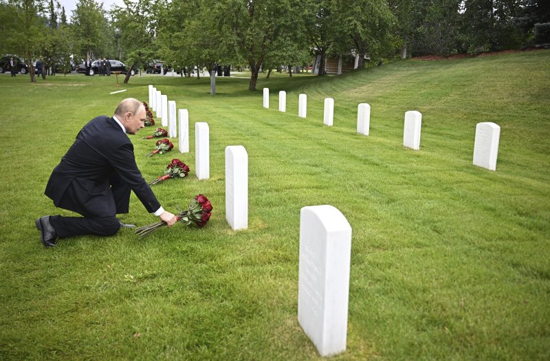 여기에도 그런 기념비가 있다는 것을 알고 있다. 여기서 몇 킬로미터 떨어진 곳에 군 묘지가 있다. 위험한 임무 중 목숨을 잃은 소련 조종사들이 그곳에 묻혀 있다. 우리는 그들의 기억을 소중히 간직해 온 미국 시민과 정부에 감사드린다.